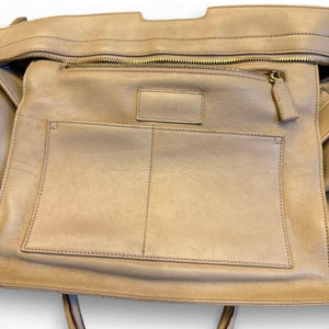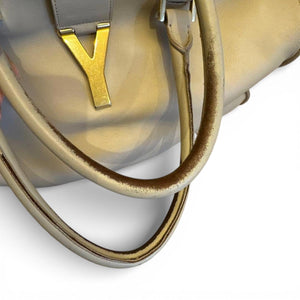This beige leather handbag from Yves Saint Laurent features a spacious interior and sturdy handles, ideal for daily use or travel. The bag includes a distinctive gold-tone 'Y' emblem on the front, adding a touch of elegance.
